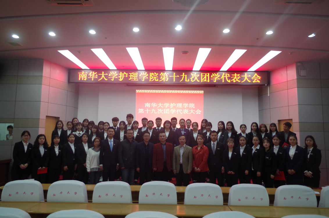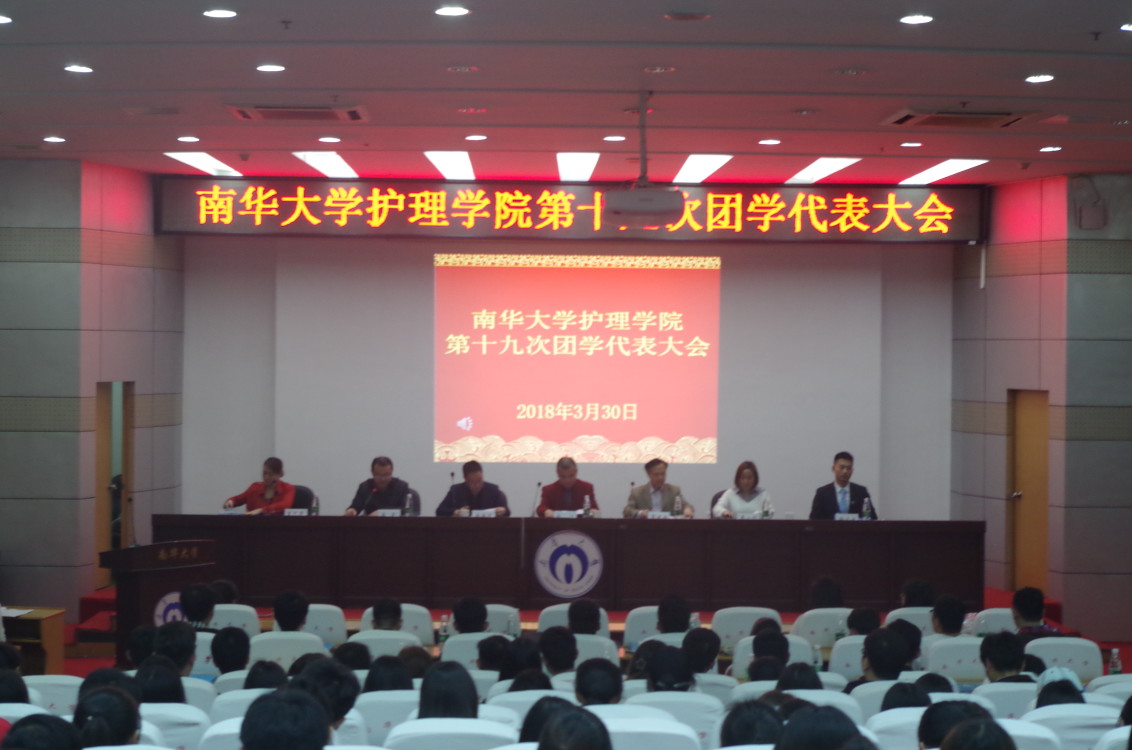 2018年3月30日晚,护理学院第十九届团学会代表大会在南华大学图书馆一楼报告厅举行。南华大学团委副书记李海洋,护理学院党委书记周浩、党委副书记彭建南、团委书记夏艺萍、辅导员廖小利老师出席大会,校学生会主席柴文涛及各兄弟学院代表应邀参加,护理学院16.17级全体学生观看大会。院学工室主任李翼主持本次大会。