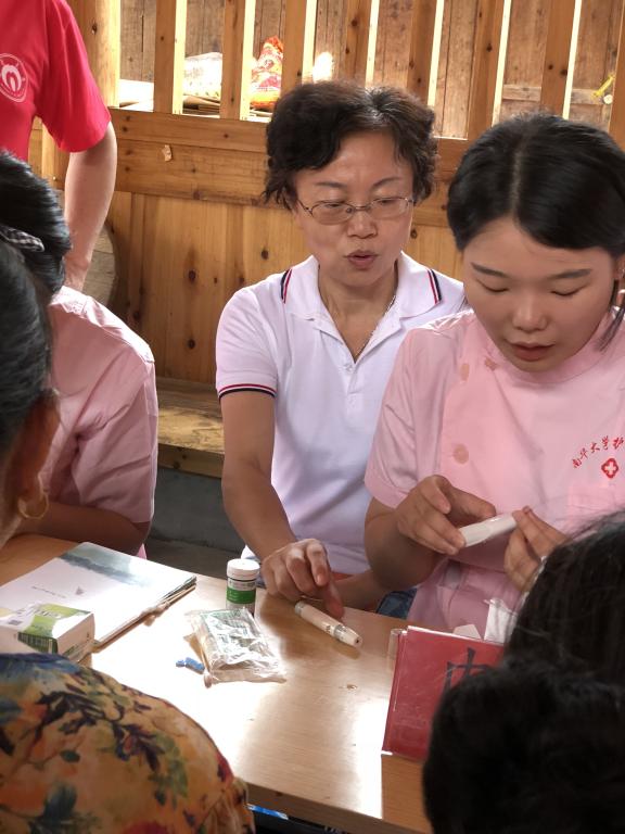 在曾谷清副院长的指导下,学生通过心肺复苏模型将心肺复苏的流程与步骤逐一向村民们展示并配以通俗易懂的讲解,“双臂垂直,利用身体力量下压,在有节奏地按压次30次,每次按压5-6cm后,口对口进行吹气两次,速度100-120次/分,如此反复五个周期”,在学生手把手指导下村民亲自“上手”,“以前只是看过别人做心肺复苏,现在自己也清楚地掌握这项技能了,侗寨的老人比较多,掌握这门急救技能就不会在老人猝倒时手足无措了”,文化村旅游店老板谭卫东说。