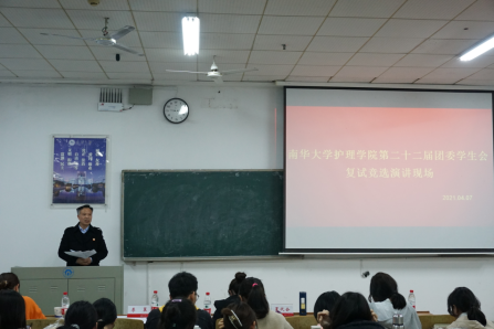 最后,彭建南副书记对本次活动进行总结。他对候选者们的积极参与和精心准备予以肯定,并表示参与竞选的同学们都有丰富的工作经验、明确的目标和详细的工作构想。他希望各位候选同学如若顺利当选,在今后能不忘初心、认真工作、服务同学,齐心协力共同组建一支团结协作、积极向上、务实进取的团干队伍。秉持“责任心、爱心、耐心、关心、细心”,共同致力于护理学院的发展。此外,彭书记叮嘱各位同学在兼顾好学习与工作的同时,要积极挑战自我,在学习与工作中锻炼自我,在服务与奉献中实现自身价值。