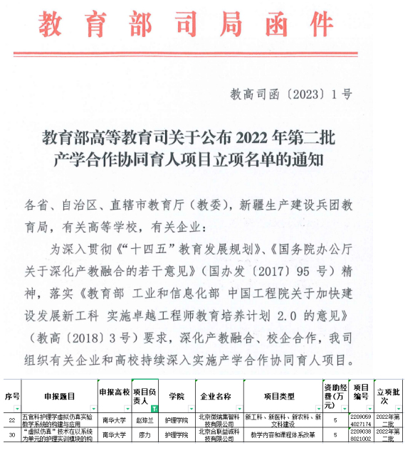 日前,教育部高等教育司公布2022年第二批产学合作协同育人项目立项名单,护理学院廖力教授和赵琼兰老师申报的项目获批立项。其中赵琼兰老师已经连续两年获批产学合作协同育人项目。