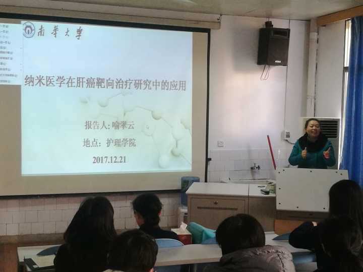 2017年12月21日下午,南华大学第十一届研究生楚岳节护理学院分论坛在护理学院学术报告厅成功举行。本次学术讲座邀请了南华大学药物药理研究所副所长喻翠云教授。护理学院涉外人文教研室主任曾颖老师主持讲座。护理学院院长廖力出席讲座,学院教师及研究生代表参加讲座。