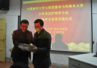 3月4日下午3点,南华大学与美国蒙哥马利奥本大学合作项目护理学专业2012级学生管理交接仪式在护理学院多媒体教室进行。出席本次交接仪式的有学生工作部副部长邹海贵、副部长张峰林,国际交流处副处长袁春阳,国际学院曹宁主任、左建宏老师、傅华丽老师、姬广礼老师,护理学院院长廖力、党委副书记余晓秋、副院长万艳平、学生党支部书记李翼、院团委书记夏艺萍、学工办老师赵琼兰及班主任老师赵玲。交接仪式由副部长张峰林主持。