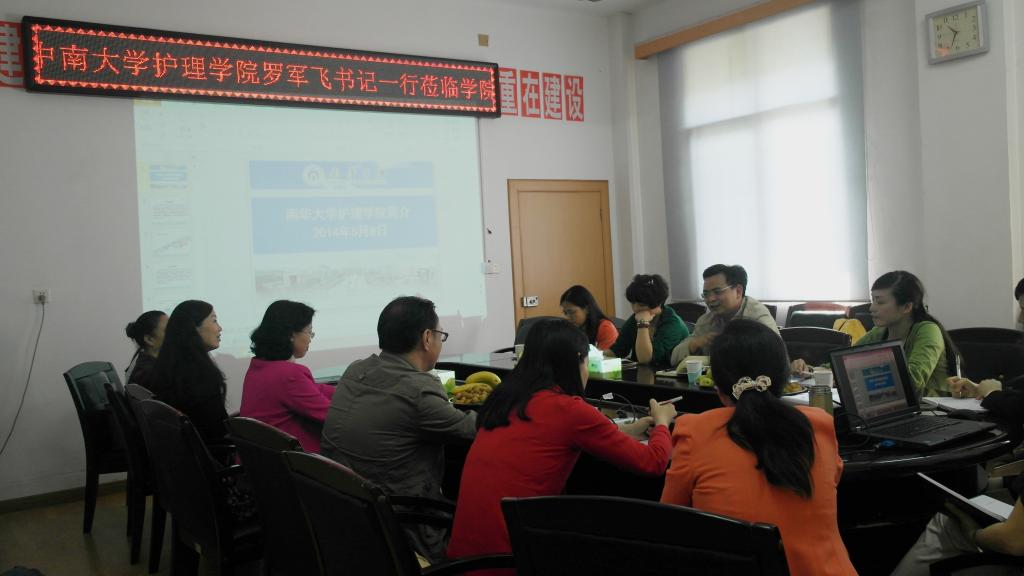 5月8日上午十点,中南大学护理学院书记罗军飞、副院长陈嘉、办公室主任姚菊琴和教学办主任毛婷一行四人莅临护理学院传经送宝。此次交流会在护理学院会议室举行。护理学院院长廖力、党委书记陈晓坚及学院各教研室主任和老师参加了交流会。此次交流会由廖力院长主持。