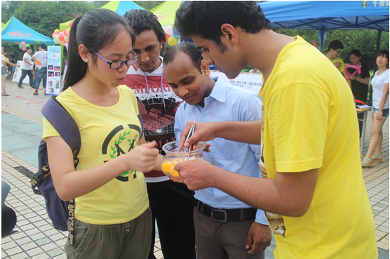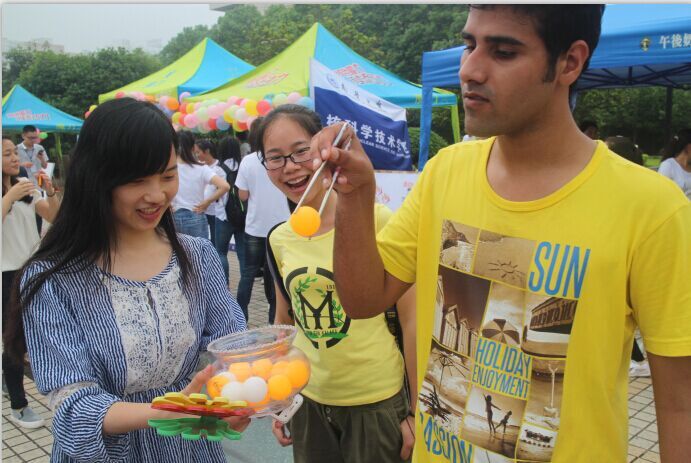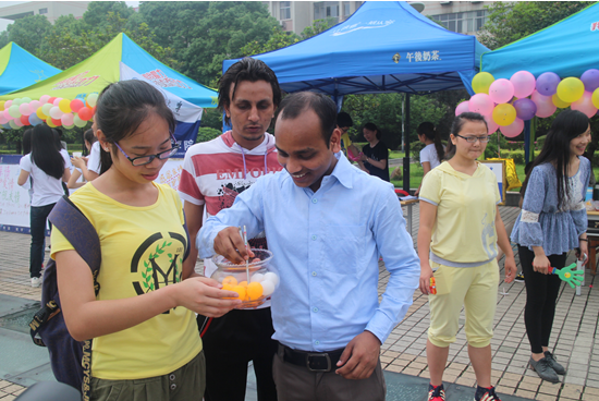 5月17日上午,南华大学5.25心理月广场活动开幕,校心理协会率机械工程学院、护理学院、经济管理学院等18个学院在广场搭建帐篷基地开展砸气球、踢毽子、转呼啦圈、你划我猜、夹乒乓等娱乐活动。来自国际学院的三名外国友人Jahanzaib.Sachin及Faraz被夹乒乓游戏所吸引,驻足护理学院阵地,相约挑战中国筷子功夫。