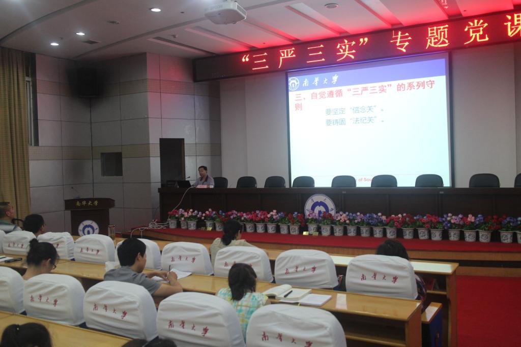 6月16日晚,南华大学纪委书记熊哲琰老师在图书馆学术报告厅讲“三严三实”专题党课,号召大家自觉奉行“三严三实”,认真履行应尽职责。校纪委办(监察处)、护理学院、文法学院近100人参与听课。