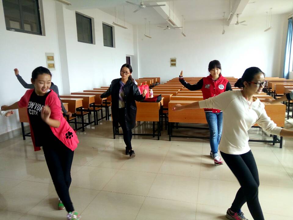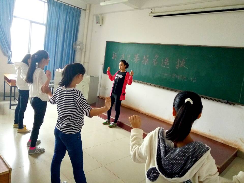 文娱部部长徐潇、副部长郭长静担任评委。参赛选手四人一组,共三组。在评委的一段舞蹈介绍后,选拔敲响战鼓。