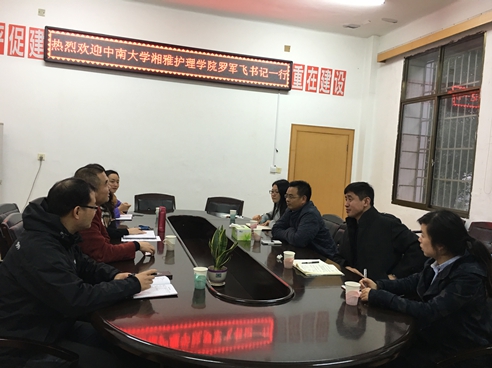 2015年11月13日,中南大学湘雅护理学院党委书记罗军飞、副书记袁世平和团委书记黎梦等一行来我院进行访问,我院党委书记周浩、副书记余晓秋、学工室主任李翼和团委书记夏艺萍等人在学院会议室与罗书记等进行深入交流。