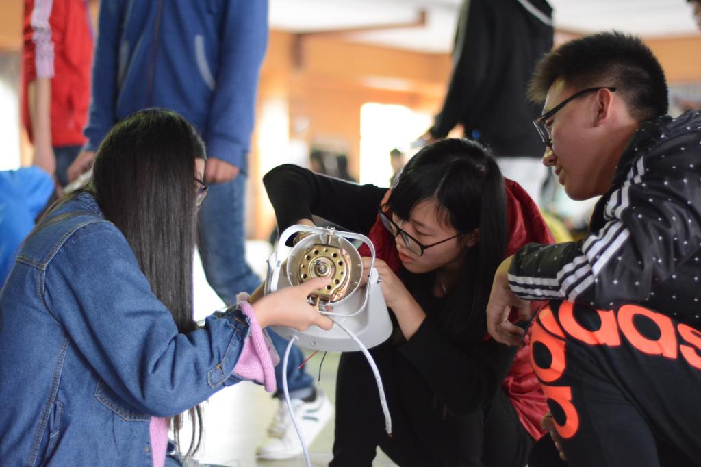 活动现场,一条红色条幅特别显眼:科普竞赛寒冬火热来袭,护理电气携手等你挑战。火红的颜色,鼓舞的口号,瞬间驱散了衡阳连日阴雨的寒冷,大家纷纷摩拳擦掌,各展风姿。复赛分为两个赛区,参赛小组不仅需要在A赛区完成电风扇维修,还需要在B赛区进行现场急救比赛。每完成一个比赛项目,组内人员都会开心地击掌而笑,给予对方鼓励。