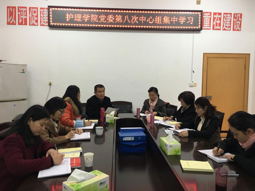 2015年12月2日下午3点,护理学院党委第八次中心组学习扩大会议暨第三次“三严三实”专题学习在学院会议室举行。会议由党委书记周浩书记主持。护理学院院长廖力,党委副书记余晓秋,党委委员万艳平、院长助理曾谷清以及学院各党支部书记参加学习。