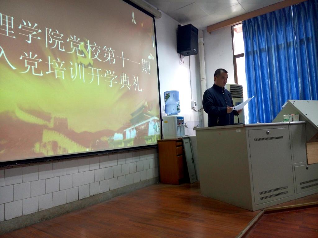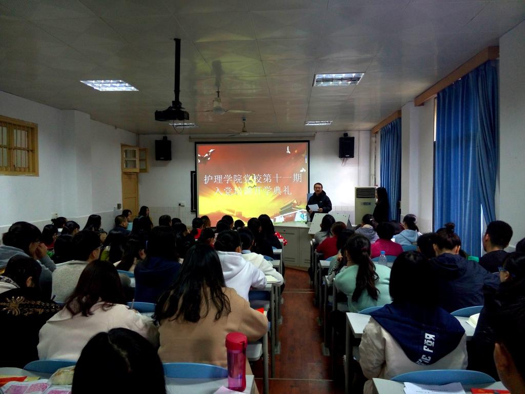 11月12日上午,护理学院分党校第十一期入党培训开学典礼在护理学院多媒体教室顺利举行,院党委书记周浩、学生党支部书记、培训班班主任李翼老师出席现场并作讲话。学生党支部组织委员彭健同学主持典礼。