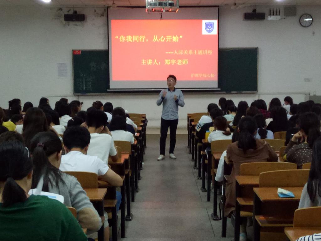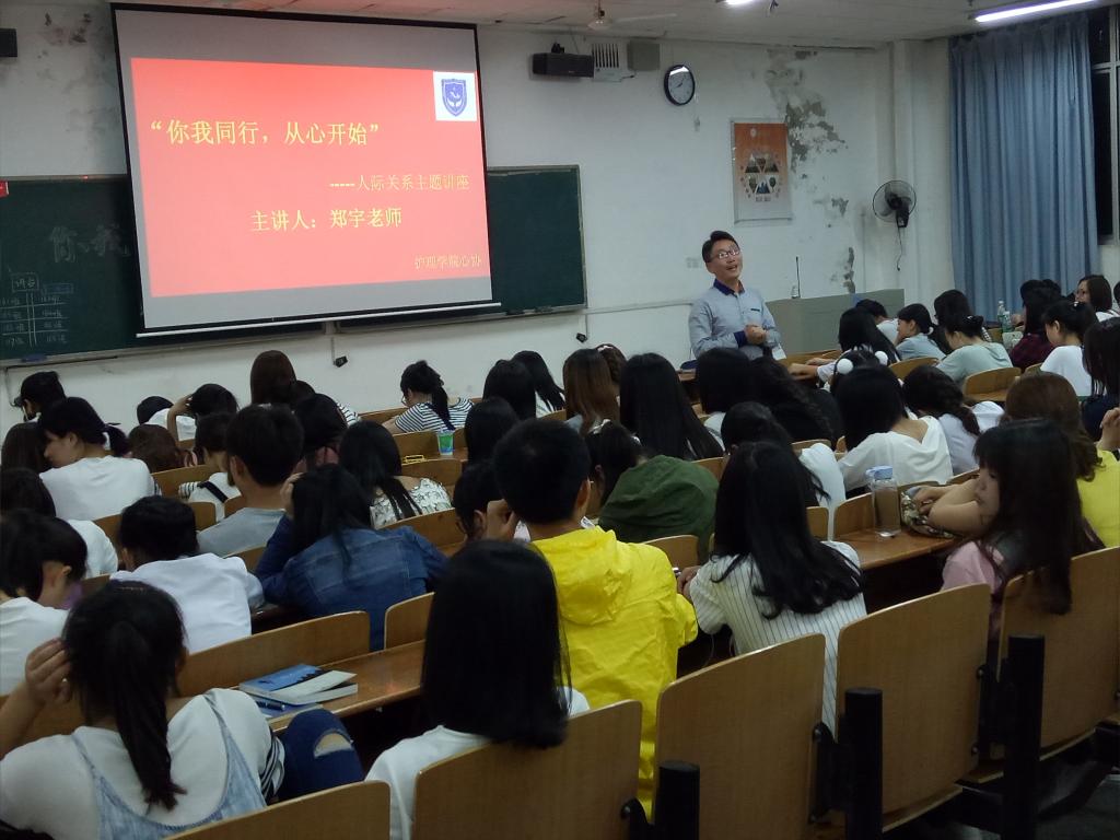 为提高本院学生适应能力和人际交往能力,也为帮助大学生调节人际关系,掌握归纳情绪管理的方法。5月6日晚7时50分,护理学院邀请了专业心理老师郑宇为同学们带来了“你我同行,从心开始”--关于人际交往主题讲座,护理学院团委书记夏艺萍出席本次讲座,护理学院各班同学积极参加讲座。
