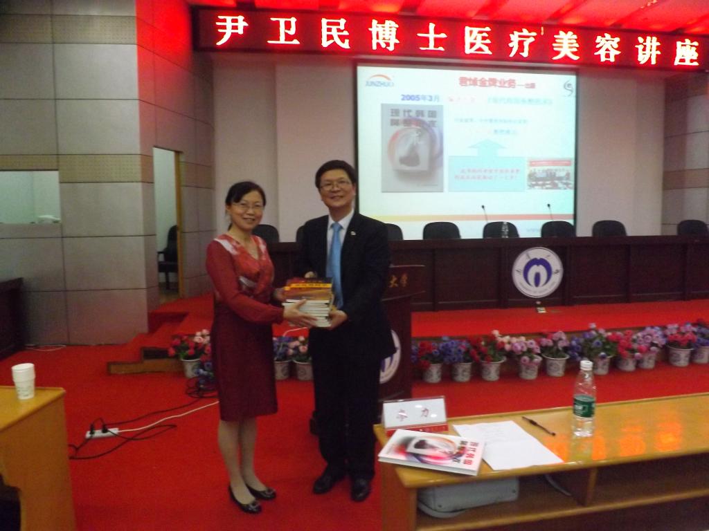 尹博士作为中国30年医疗美容发展的见证者、践行者、推动者用自己的亲身经历向大家阐述了医疗美容的内涵、发展历史、行业特点、前景等。指出医疗美容是个性化特征明显的感觉消费,需要用审美和耐心与医疗求美者进行沟通。而进行医疗美容手术需要做到“轻、柔、准、爱”。尹博士鼓励大家做个有用之才,在生活中做到日清日高,工作中做到及时归位。现场尹博士向在座的各位老师赠送他参与出版的《现代韩国鼻整形术》,并宣布他将为护理学院设立第一个以个人名义赞助的奖学金。