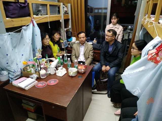 护理学院领导老师来到学生寝室与实习生进行交流,对实习生的生活和工作进行了询问,并嘱咐同学们注意安全,希望同学们在实习中学习更多,收获更多。同学们对老师的到来感到十分亲切开心,感谢老师们不辞辛苦的带来关心和爱护,并向老师保证在实习中认真工作,不辜负老师们的厚望。交流持续到晚11点。