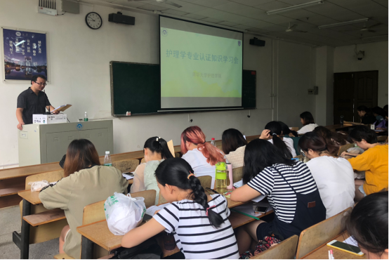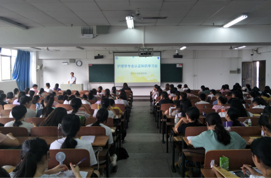 南华大学护理学专业认证知识学习会于2018年9月6日上午在红湘校区第一教学楼111和211教室举行。学院党委副书记彭建南出席知识学习会,学工办主任李翼和团委书记夏艺萍主讲,全体2016级和2017级护理本科生参加学习会。