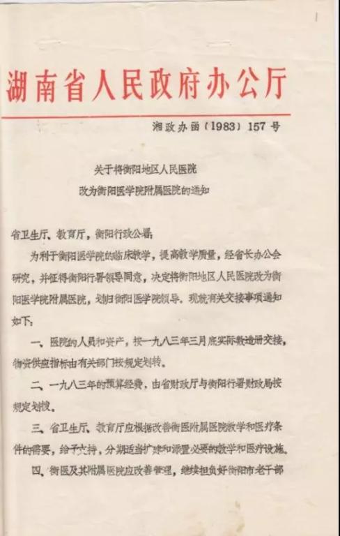 1977年7月26日,中共湖南省委《关于衡阳医学专科学校改为衡阳医学院的通知》。