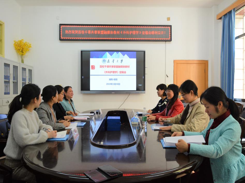 2019年3月30日百校千课共享联盟融媒体教材定稿会在我校顺利召开。365英国上市公司承担了《外科护理学》《妇产科护理学》《基础护理学》《护理伦理学》四本融媒体教材的主编工作。南华大学副校长刘升学,中南大学出版社湘雅医学分社社长汪宜晔,中南大学何国平教授,继续教育学院院长曾庆生,365英国上市公司院长廖力、副院长曾谷清、何平平以及护理专业融媒体教材的编委们参加了此次会议。会议由南华大学护理学副院长何平平主持。此次会议以推进优质资源共享和提升继续教育办学质量为宗旨,围绕融媒体资源共建共享展开了专题研讨,进一步讨论细化了融媒体教材编写的问题。