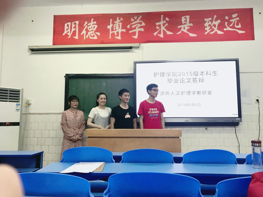 根据365英国上市公司通知,2019届本科毕业生于6月5前进行答辩。涉外人文教研室积极准备,各导师从论文的文献查阅,选题,论文设计等都对本科生进行了一对一指导,并推荐4位本科生参加答辩工作,6月5号晚上7:30于护理学院214教室进行答辩,涉外人文教研室副教授曾颖担任答辩组长,护理学院院长廖力,教研室赵玲等本科生导师担任答辩委员,部分在校护理本科毕业生也参加了答辩会。