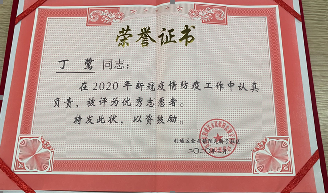 丁鹭在疫情防控中被评为优秀志愿者