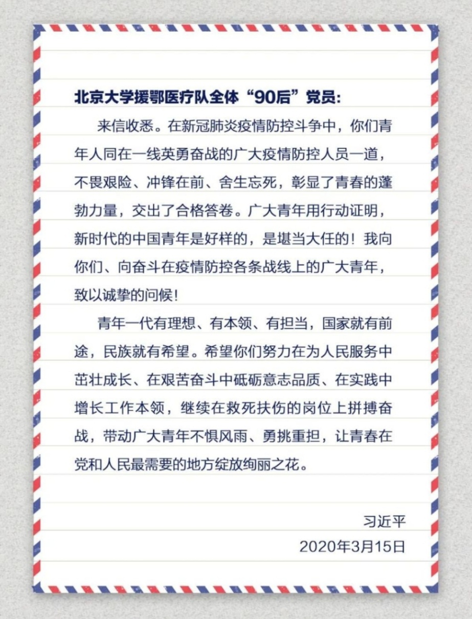 (3月16日,北京大学援鄂抗疫国家医疗队在武汉召开会议,传达习近平总书记给医疗队全体“90后”党员们的回信。图为会场)