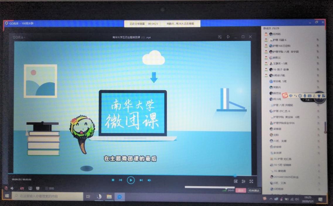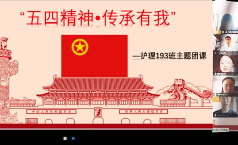 此次线上主题团日活动围绕“作为一名新时代的青年,应如何传承五四精神、担当民族复兴大任?”“如何把爱国之情和报国之志化为实际行动,用奋斗铸就最美的青春?”等话题展开,同学们以班团集体云端相聚的方式发表自己的看法与感悟。护理191班梁林同学发表活动感悟:作为新时代的青年学子,我们应该肩负起传承五四精神的重任,要为民族的伟大复兴贡献力量,用奋斗铸就最美好的青春,用奋斗实现自己的理想,用奋斗为社会贡献自己的价值。