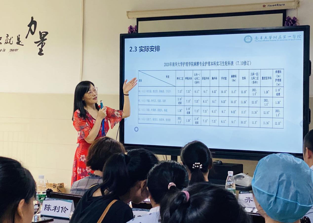 尹心红主任宣读实习安排表,全体实习生就实习相关问题进行提问,老师们逐一回答,并强调实习生们要在带教老师的指导下正确执行医嘱,明确自己的实习目标和今后的努力方向,努力成为一名优秀的麻醉护士。