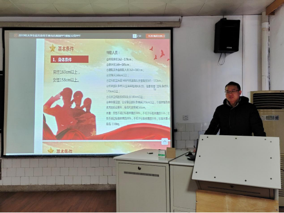 随后,李翼老师从入伍要求、基本流程、优惠政策等方面向在场学生进行征兵宣传解读,让大家深入了解大学生征兵相关信息。他强调,大学生入伍是国家利益、人民利益以及军队现代化建设的需要,新时代青年大学生应该强化责任和使命意识,积极参军。