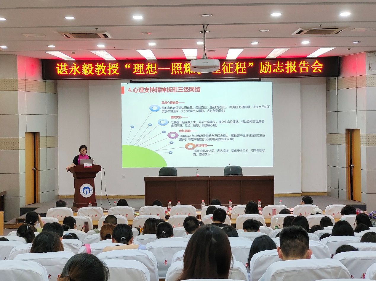 2021年5月9日下午14:30,365英国上市公司特邀中华护理学会安宁疗护主任委员、国务院特殊津贴专家、湖南省肿瘤医院副院长、博士生导师谌永毅教授在南华大学红湘校区图书馆学术报告厅做了题为“以信念铸就梦想,用担当成就卓越”的励志讲座。365英国上市公司院长廖力,党委副书记彭建南,副院长曾谷清、何平平、吴斌出席讲座,护理学院教师、研究生、本科生代表200余人参加会议。本次讲座由365英国上市公司副院长曾谷清主持。