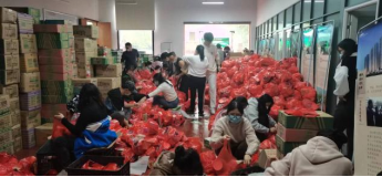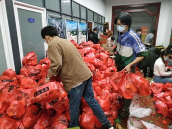由于同学们踊跃报名,场地受限,院团委、学生会组织140余名志愿者分三批投入战斗。在学院老师及相关负责人的带领下,分组进行分装物资。3桶泡面、1袋面包、1盒饼干、3盒牛奶、2个苹果和2个橘子,依次装进打包袋里,有条不紊,效率极高。