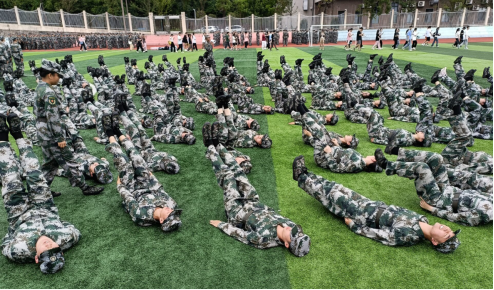 日常训练中,“日出而作,日落而息”是军训常态。烈烈骄阳无情刺穿新生娇嫩的肌肤,映照在迷彩帽下坚毅的脸庞,汗水从微薄积淀,浸透全身。隔着军训鞋底的脚与炙烤后的大地亲密接触,微微蜷缩。“稍息”、“立正”、“正步走”,教官的口号总是铿锵而有力,打破世界的间隔,叫醒神游天外的新兵。夜晚,队伍有序排成方形,歌声嘹亮。
