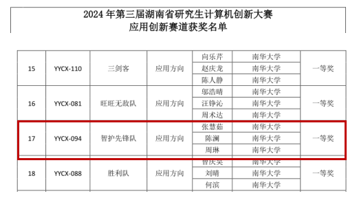 此次大赛中,由我院曾谷清教授指导,2023级研究生张慧茹主持的项目《“环”绕健康-老年智能化医疗平台》经过11月15日初赛评审、11 月29-30日决赛,荣获第三届湖南省研究生计算机创新大赛一等奖。我院曾谷清教授获评优秀指导老师。