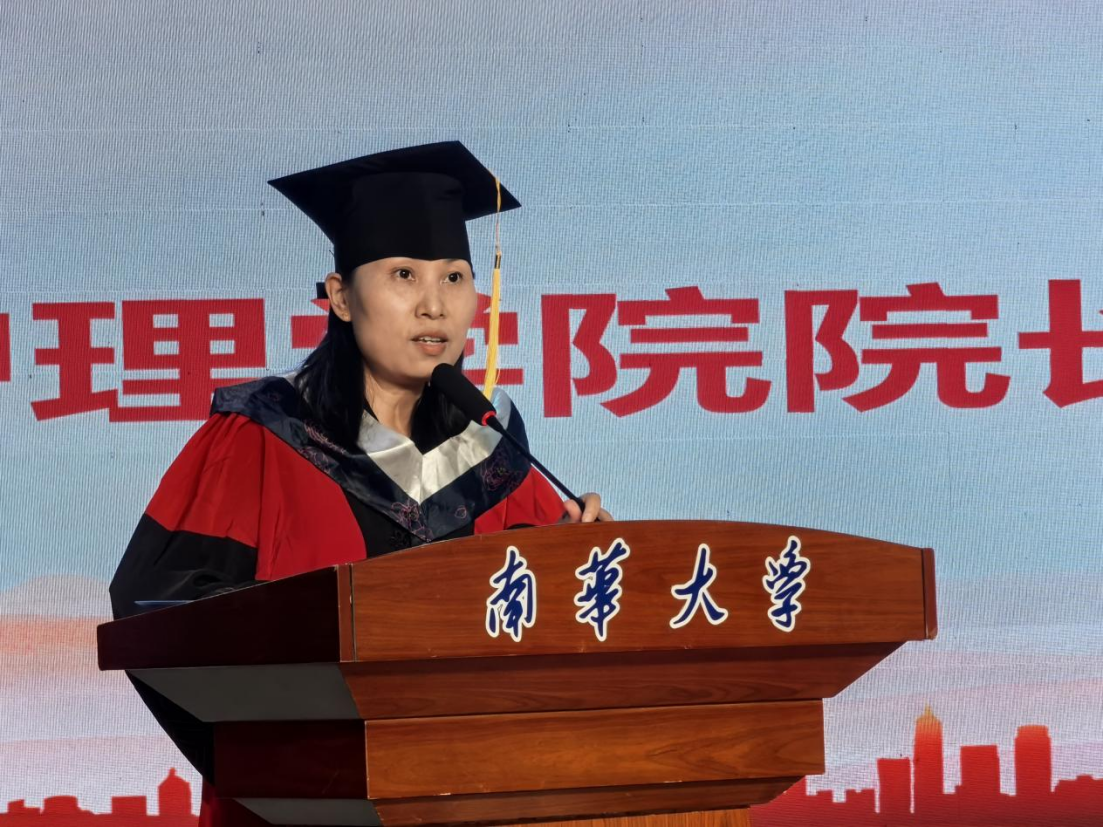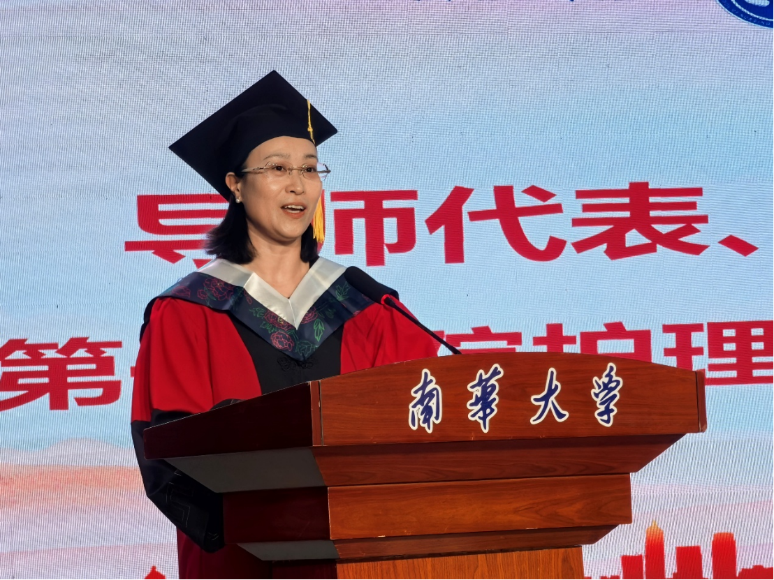 南华大学附属第一医院护理部主任周艳辉作为导师代表和校友代表致辞,她寄语毕业生们:一要以学为帆,破浪前行;二要以爱为锚,温暖守护;三要以责为舵,勇毅前行。