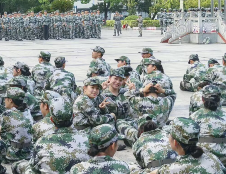 除了紧张的训练,休息间隙的“小美好”更显集体温情。训练暂停时,新生们围坐在广场边的台阶上,有的帮同伴揉捏发酸的肩膀,有的细心整理对方歪斜的衣领和褶皱的裤脚。“我家乡的桂花已经开了,等国庆回去带你们尝尝桂花糕!”“假期咱们约着去图书馆预习专业课吧?”从家乡美食到学业规划,从天南地北的趣事到训练中的小技巧,欢声笑语驱散了身体的疲惫,也让原本陌生的同学渐渐成了彼此信赖的“战友”。十几天的朝夕相处,让这支临时组建的“迷彩队伍”,有了家一般的温暖与凝聚力。