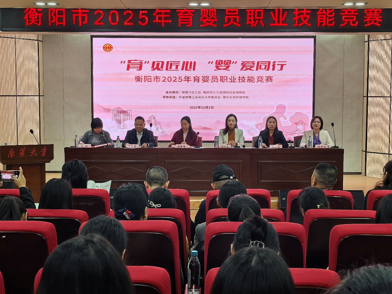 上午9时30分,竞赛开幕式在南华大学医研楼学术报告厅举行。南华大学工会常务副主席陈柒叁代表学校对各位领导嘉宾和参赛选手表示热烈欢迎,感谢市总工会、市人社局对南华大学的长期支持。裁判员代表和参赛选手代表先后进行庄严宣誓,分别承诺恪守公平评判原则与秉持良好竞赛风尚。衡阳市总工会党组书记、常务副主席杨青青在讲话中指出,本次育婴员职业技能竞赛,是为全市育婴从业者搭建起技能展示、以赛促学、交流研讨的平台,并向参赛选手以及全市从事育婴行业的广大从业者提出三点希望:要坚守“育”见匠心的专业追求、要传递“育”见美好的行业温度、要共绘“育”见未来的发展蓝图。