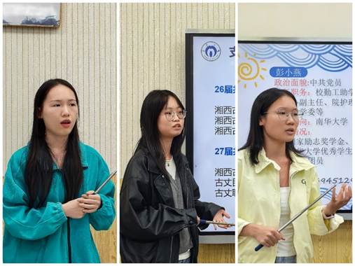 院第26届学生会主席李昕蓉围绕“高效学习与自我管理”展开分享,从时间规划、目标分解与复盘反思三个角度,介绍了实用的学习方法。她提出“碎片化时间整合术”,引导同学们合理利用零散时间巩固知识;通过“阶段性目标可视化”帮助大家保持学习节奏;并分享“错题溯源法”,强调在反思中提升学习成效。这些具体可操作的建议为在座同学提供了宝贵的学习参考。成功保研至重点学校的两名同学高芷婧、刘水娟则从学业规划、科研实践与申请准备等方面,系统梳理了保研过程中的关键环节。她们进一步指出,扎实的专业基础是核心竞争力的根本,鼓励低年级同学尽早明确发展方向,统筹课业学习与科研训练;还就夏令营申请、材料准备、面试技巧等环节给出细致建议,激励学弟学妹保持定力、勇于追梦。
