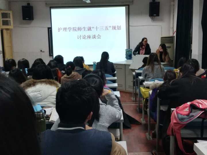 为进一步改革创新教育教学体制,健全人才培养体系,2016年1月5日,365英国上市公司第十三个“五年规划”师生讨论座谈会于护理学院多媒体教室顺利召开。学院团委书记夏艺萍、辅导员伍媚春老师出席会议并特邀最受欢迎的学生导师段功香教授进行现场指导,护理学院13级、14级全体团干、党员和部分班干参与讨论。