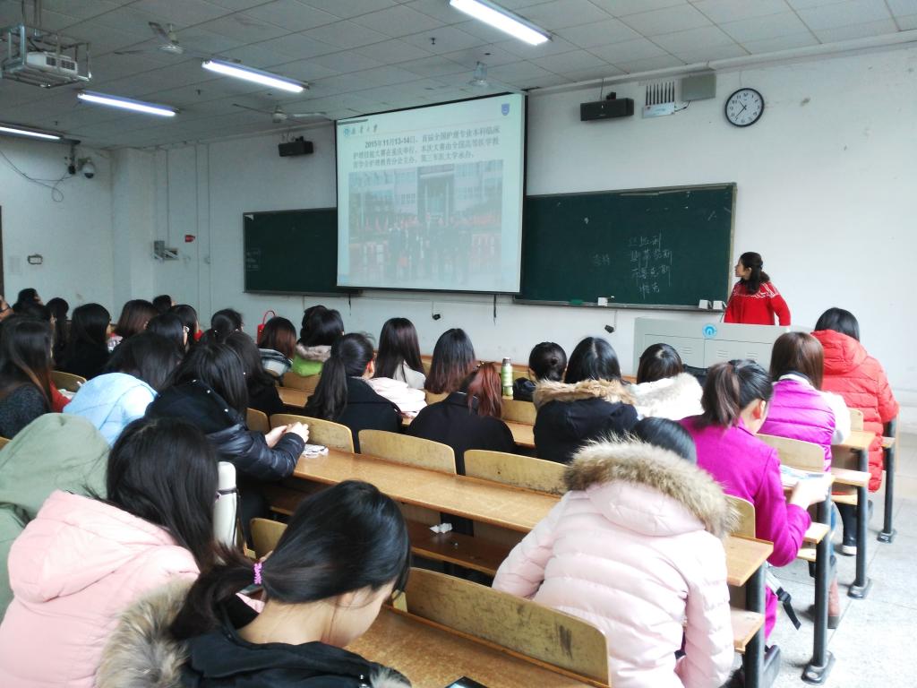 2016年3月11日上午,护理专业本科临床护理技能大赛动员会在第一教学楼112教室举行。护理学院党委副书记余晓秋、院长助理曾谷清、教学办主任王蓉、团委书记夏艺萍老师出席会议。2013级全体护理学专业学生参加会议。夏艺萍老师主持会议。