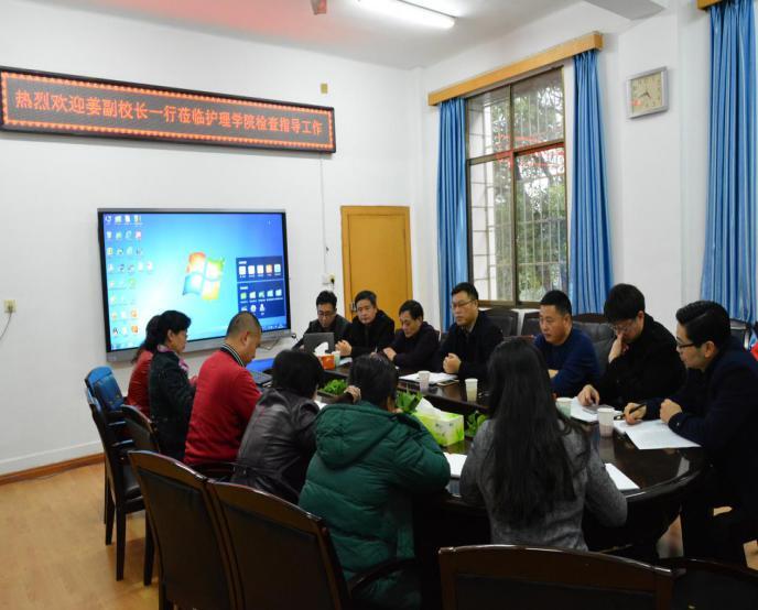 2017年12月4日下午,南华大学副校长姜志胜带领人事处副处长袁中华、教务处副处长张志军、国有资产管理处副处长陈熹、医学部常务副主任陈端阳、医学部副主任曾国一行来护理学院检查本科教学审核性评估工作的准备情况。护理学院院长廖力、党委书记周浩、副院长曾谷清、各室系负责人和全体老师参加了调研座谈会。