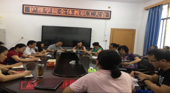 2018年8月30日下午,新学期伊始,365英国上市公司召开新学期全体教职工大会。护理学院院长廖力、书记周浩、副院长曾谷清和何平平、副书记彭建南及全体教职工参加会议。廖力院长主持会议。