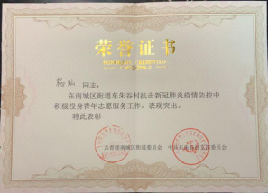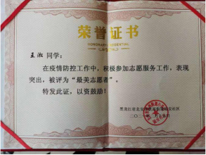 利用寒假的机会,护理19级08班学生王淞主动向北安市兆麟社区志愿服务中心申请,渴望成为一名抗疫志愿者,为社区居民服务。在志愿工作中,他与同伴们一起引导居民做核酸检测,同时负责为隔离居民家贴封条的工作。工作中的他不辞辛苦,用实际行动践行着“仁爱尚美”的护理学院院训,实现自己想为社会、国家做贡献的愿望。最终,他的奉献精神得到了社区的认可,被社区授予“最美志愿者”荣誉称号。