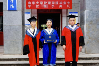典礼开始之际,全体毕业生在段功香教授和万艳平教授的带领下,踏出护理学院的荣誉门,在道路两侧观众的热烈掌声中来到衡阳医学院楼。紧接着,随着庄严的国歌奏响,学位授予仪式正式开始。首先,曾谷清副院长宣读《南华大学关于授予护理学院2021届硕士研究生硕士学位的决议》,何平平副院长宣读《南华大学关于授予护理学院2021届本科毕业生学士学位的决议》,彭建南副书记宣读《南华大学2021届优秀毕业生表彰文件》。接着,夏昆副校长和廖力院长为2021届毕业生拨流苏、颁发学位证书。