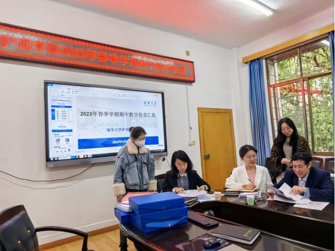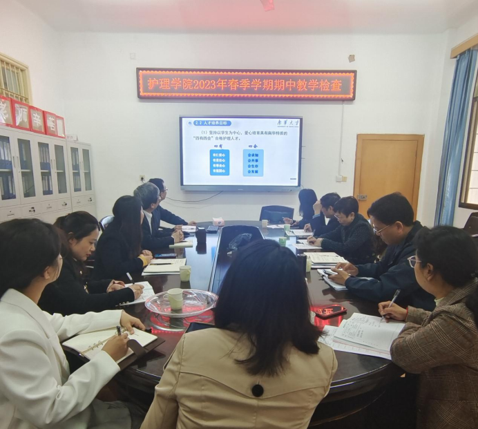 2023年4月27日上午,南华大学教务部副部长周洲带队莅临护理学院开展2023年春季学期期中教学检查。护理学院院长李忠玉、党委书记袁春阳、副院长曾谷清、院党委委员吴飞、院教学督导以及各系室负责人和教师代表参加迎检工作会议。
