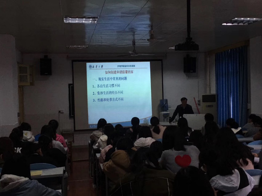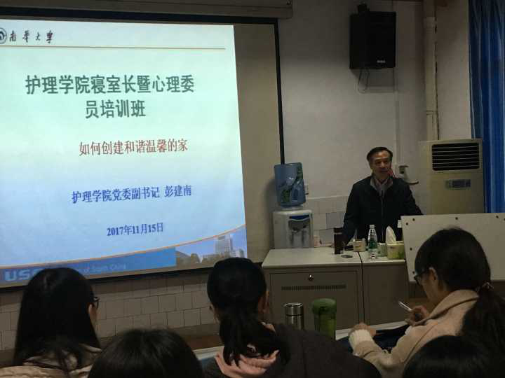 2017年11月15日中午,护理学院心理协会召开的寝室长暨心理委员培训讲座在护理学院多媒体教室顺利召开。护理学院党委副书记彭建南,团委书记夏艺萍出席此次培训讲座,15级、16级、17级各班的心理委员和寝室长出席此次讲座。
