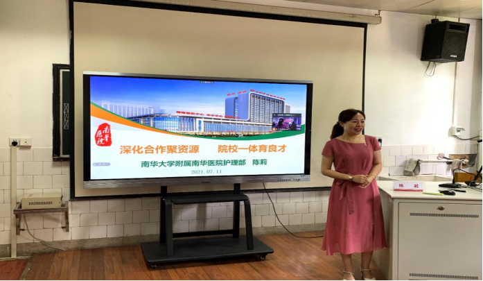 紧接着,南华大学附属南华医院护理部主任陈莉以《深化合作聚资源院校一体育良才》为题,以院校合作的资源共享、创新同步、优势互补、互惠共赢、协同发展原则为切入点,围绕医院文化、服务理念、制度建设、教学体系、科研活动与成效、信息化建设等方面进行了介绍。