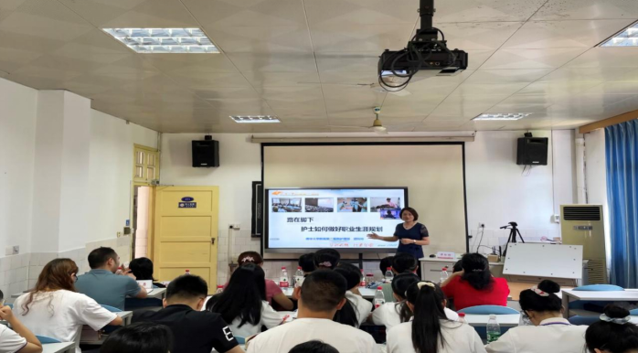 接着,南华大学附属第二医院护理部主任谭玲玲以《护士如何做好职业生涯规划》为题,主要从护理专业内涵、优秀护士特质、护士专业发展与选择三个内容由浅入深地展开讲解,让同学们明白了“什么是护理”、“为什么选择护理”、“护理的价值是什么”。她鼓励同学们要从教学、科研、管理、专科化发展等方面给自己的职业生涯定位,抓住发展机遇、奋进拼搏,力争使自己成为优秀护理人。