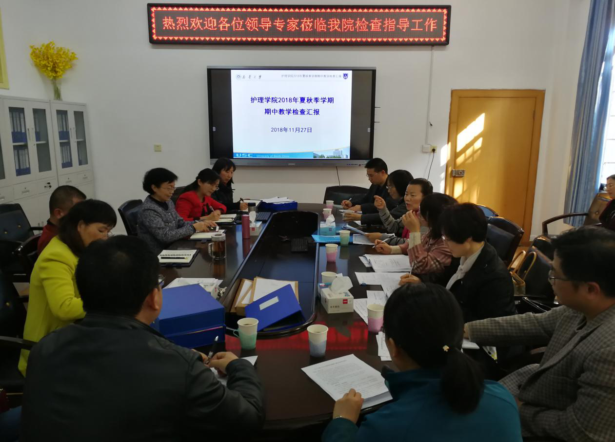 为持续加强本科教学过程管理,不断促进学校教育教学管理水平和教学质量稳步提升,2018年11月27日下午,南华大学2018年秋季学期期中教学检查专家组一行7人在教务部副部长罗晨晖的带领下到护理学院进行秋季学期期中教学检查。护理学院院长廖力、党委书记周浩、副院长何平平和曾谷清及全体教师参加检查。