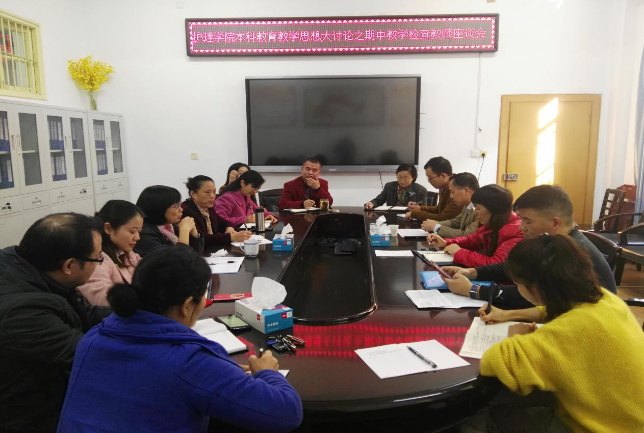 首先,护理学院全体教师召开教师座谈会,针对在本学期教学过程中学生的学习状态进行探讨。万艳平教授作为学校教学督导组专家,她强调集体备课的重要性,理论课要明确重点、难点,实验课要标准化、规范化;院长廖力教授介绍了她在课堂教学管理中的经验,上课时可以让学生按照班级分班坐,班与班之间进行对比,便于管理课堂教学;学院教学督导组组长段功香教授指出,研究生作为助教,在承担实验教学时要注重着装、教态和实验操作的规范性,树立教师的威信。