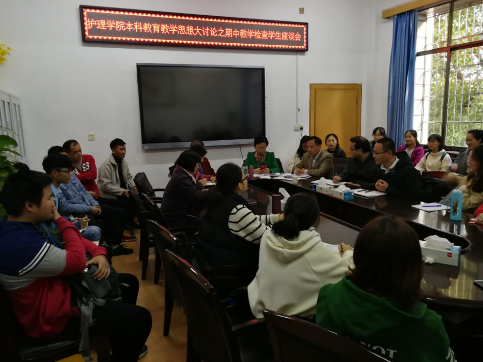 随后,护理学院2016级-2018级各班学生代表齐聚会议室召开评教座谈会。每个班级派出1名代表反映在本学期学习过程中遇到的教学问题及对老师的评价。2016级本科生对莫文娟和赵琼兰老师的授课给予了较高评价,王蓉老师的实验课讲解的很细致;2017级本科生反映机能实验课有的实验室电脑有问题,影响实验数据的输出,还有学生建议用思维导图进行知识点的梳理;2018级护理本科生反映一些基础课程的实验设备有点老旧,系统解剖学实验教师应该调整教学顺序,可以遵循教师示教—学生看标本—教师指导的顺序进行。