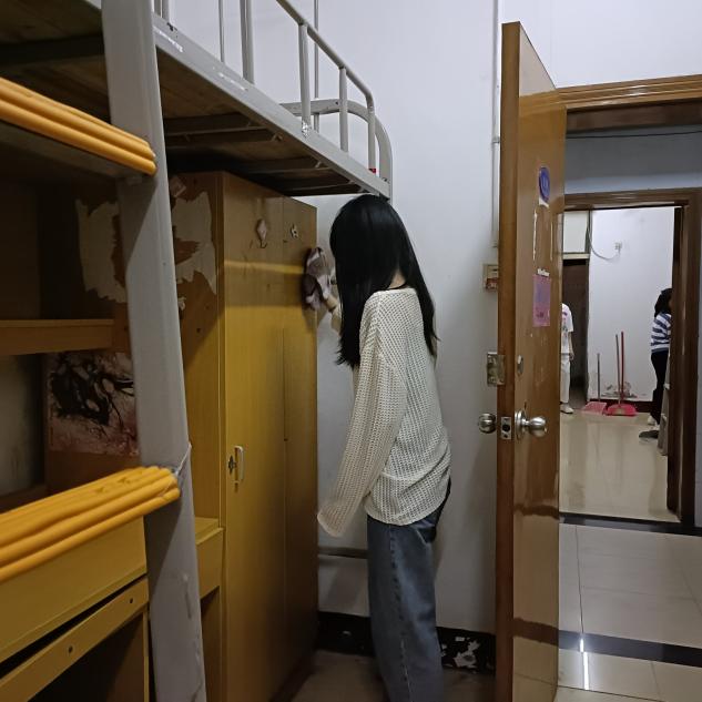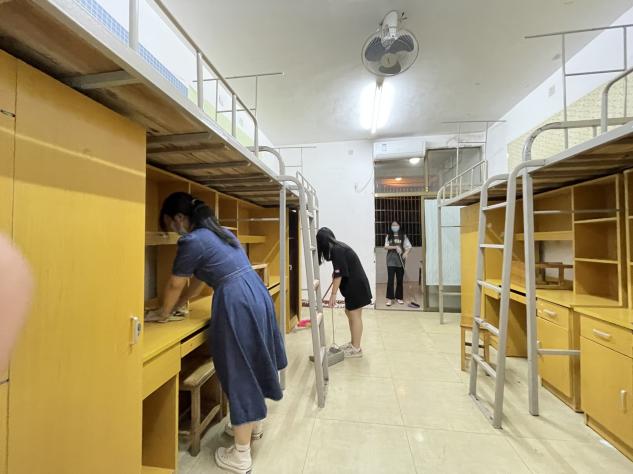 同学们早早地便带上清洁工具到达打扫区域做准备。分配任务后,她们四人一组开始对宿舍逐一进行卫生打扫。经过两个月的暑假,宿舍的各个角落里已布满灰尘,同学们从天花板到地面,从床铺到桌椅,从洗手间到阳台,不放过任何一个卫生死角,对每一间宿舍进行全面清洁。在大家的共同努力之下,窗明几净,整个宿舍焕然一新。