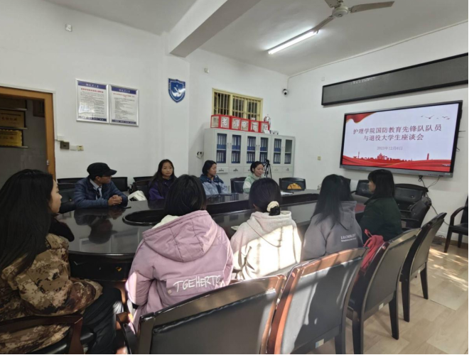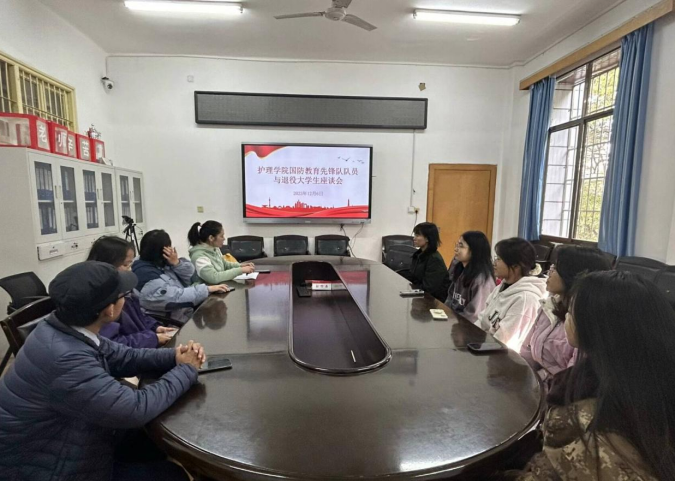 12月6日中午,护理学院国防教育先锋队队员与退役大学生座谈会在护理学院207会议室成功召开。座谈会由学工办主任陈小兰主持,共八名学生参加了会议。