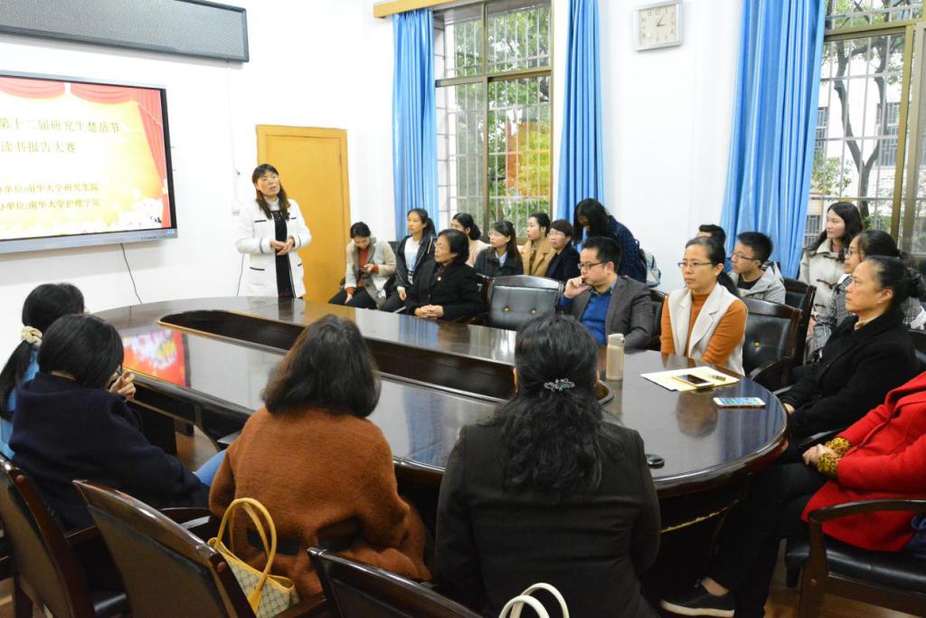 2018年11月11日,南华大学第12届研究生楚岳节护理学院分论坛系列活动之医科类研究生读书报告大赛在护理学院学术报告厅成功举办。南华大学衡阳医学院尹凯教授和张艳教授、公共卫生学院吴成秋教授、药学与生物科学学院郭紫芬教授和刘运美教授,以及护理学院曾谷清教授、万艳平教授、段功香教授、李健芝副教授和莫文娟副教授担任此次大赛的评委。护理学院、药学与生物科学学院、衡阳医学院和公共卫生学院共36名研究生报名参加,最终现场参加读书报告竞赛31人。